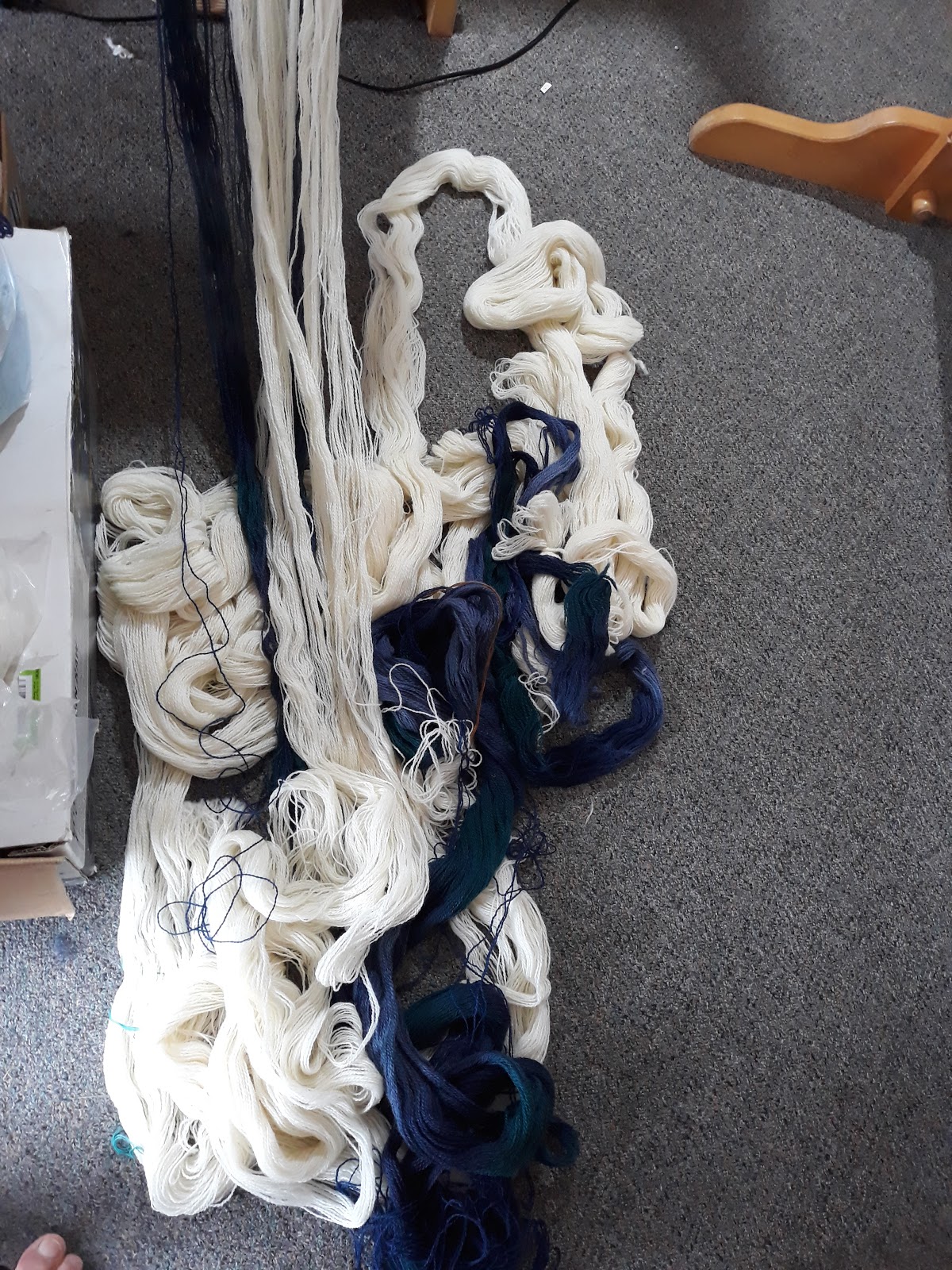 Unfortunately the moths had munched the yarn I used originally so I used some NZ romney being a hard wearing fibre. I had not kept records from the first run but remembered the brief had been "to look like Opoutere beach as you stepped out of the trees onto the sand". Originally I had used a draft from an old Handwoven magazine for rep weave glass mats and luckily I found that. Decided to weave them in 2 lots of 15 mats each so set about dyeing one warp chain with navy, a murky mountain blue and teal, the second chain was left natural.